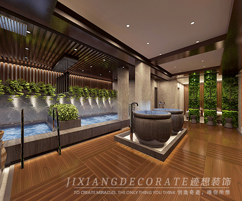 淋浴区和温泉区整体绿植墙,给人以清新自然放松的感觉能区域贯通的开放缓冲的区域。采用日式风格。